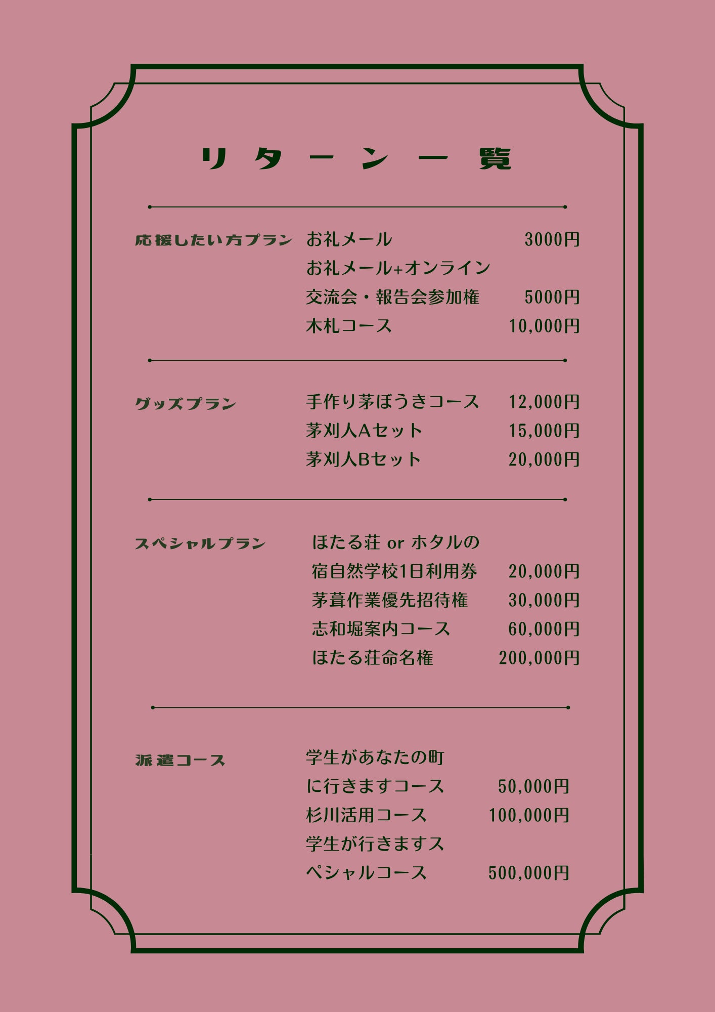 2022/06/28 10:54~"結"を広げる。"かやぶき"を未来に残す!地域と連携した学生プロジェクト!~クラウドファンディング終了まであと2日というところで、目標の69%である83万円を突破することができました!ご支援本当にありがとうございます!!!!クラウドファンディングを始めた当初は、どうなるやらメンバー皆心配していました。しかし、始めて以降、「かやぶきのある景色を守りたい」という想いを同じくする方が、こんなにも大勢いて、たくさんの方が支援してくださることを知り、驚くと共に、想いを共有できる嬉しさやありがたさでいっぱいです。皆さまの共感や応援、そして支援が、本当に全国のたくさんの人との和を広げていっており、まさに現代の”結”が広がっているのだなと日々実感しています。終了まで残りわずかです。SNSやご友人への情報拡散、引き続きよろしくお願いいたします!! もっと見る