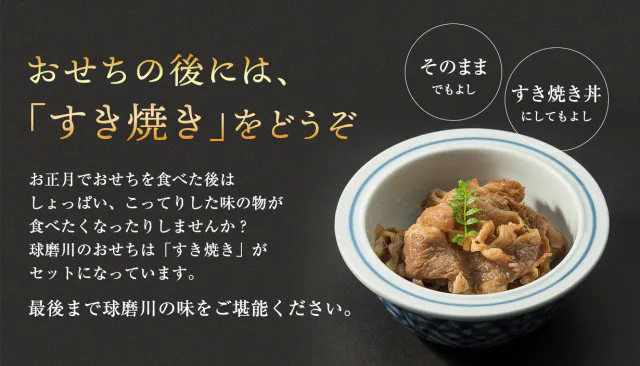 一人一重であろうとも、おせち料理として召し上がる定番品は残しつつ、“+1品”としてのすき焼きをお付けしてご販売。