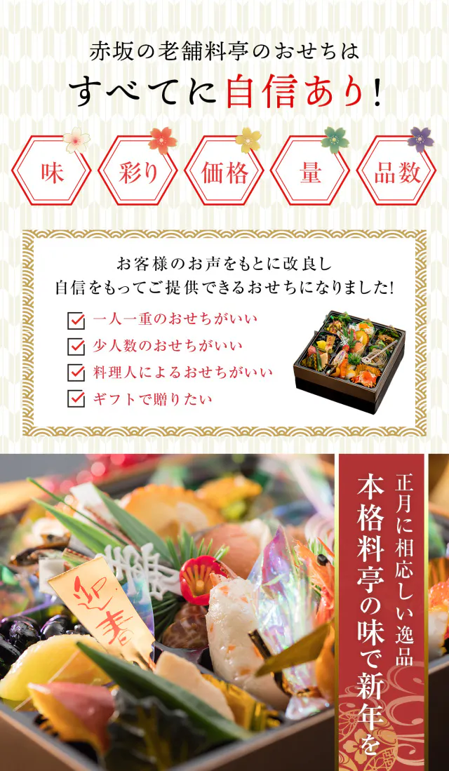 一般的な料亭がお作りしますおせちは、通常一人当たり【1万円~2万円】する所を、価格も頑張らせて頂きます!