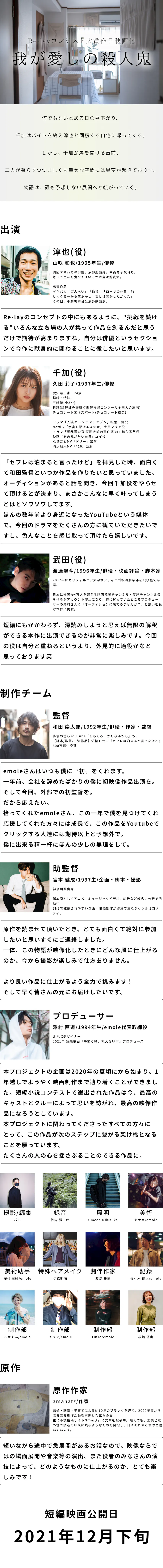 今年は、『我が愛しの殺人鬼』がより多くの方々に届き、本プロジェクトに参加してくださったクリエイターやアーティストの方々が次のステップへと繋がる機会にできるよう作品作りに挑戦します。