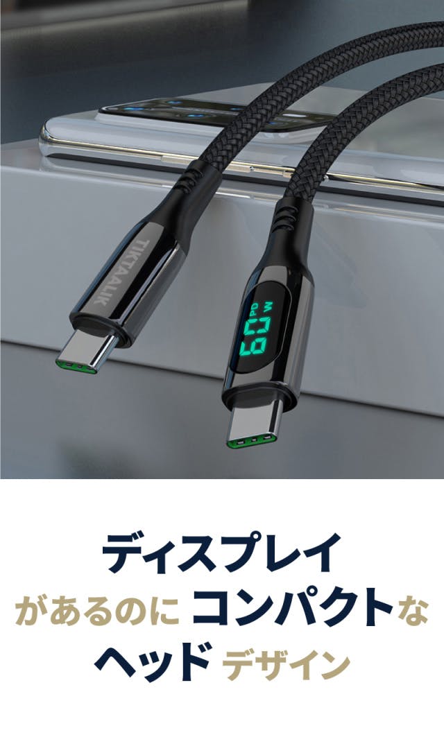 TIKTAALIK 100W PD Cableは100W急速充電が可能でQualcomm Quick Charge 4.0などさまざまな機能と互換ができます。またE-markerチップセットを使用しており、より高い性能を発揮します。さらにLCDディスプレイは鮮明で、一目でわかるように電力と急速充電を表示します。小数点第1位まで表示されるため、より正確な測定が可能となります。PD (Power Delivery) 急速充電が可能で、より効果的な充電ができ、引張強度の高いナイロンを使用しています。