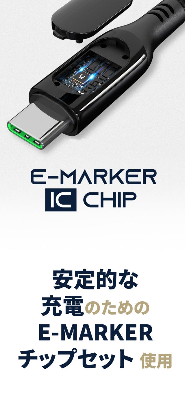 E-MARKERチップセットを導入し、安定的に20V / 5A出力の100W 急速充電にスムーズに対応します。C Typeを導入しているMacBookとノートパソコンの充電にも非常に高い互換性を発揮します。