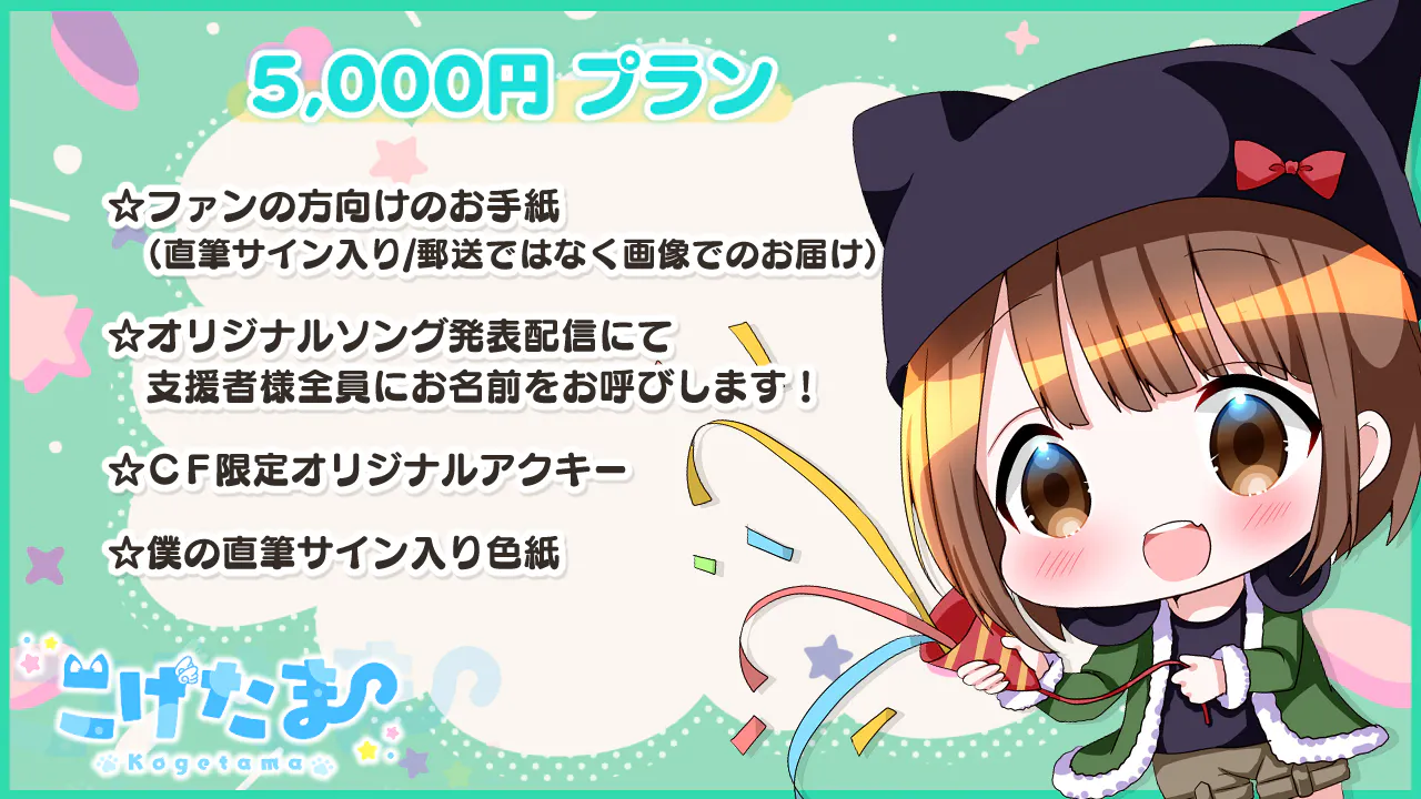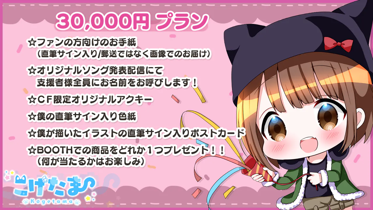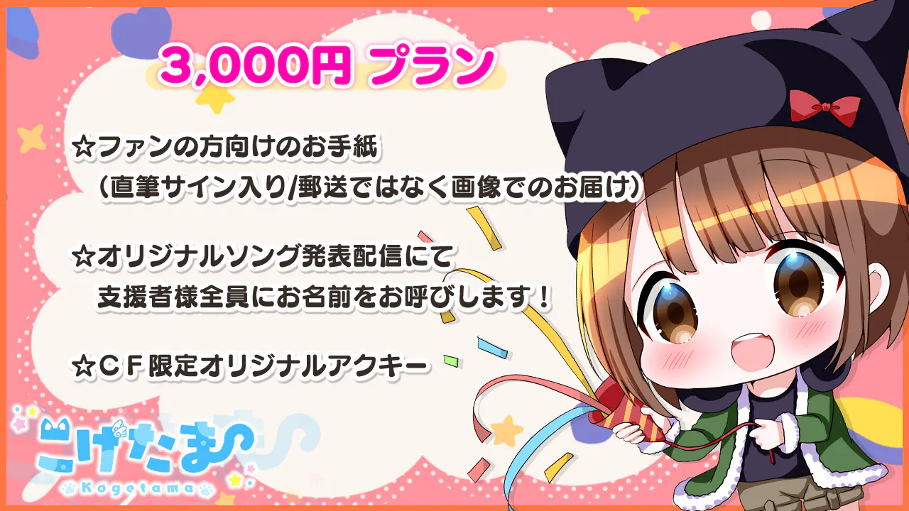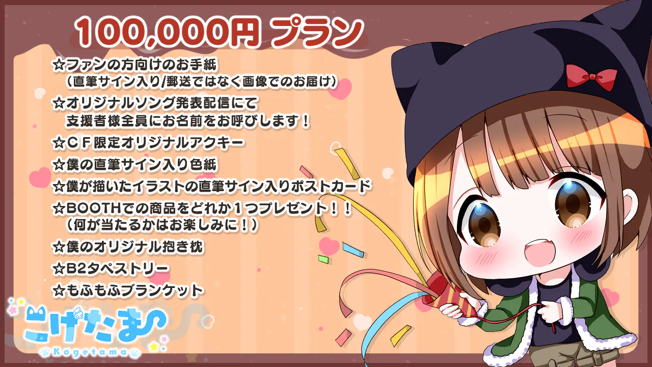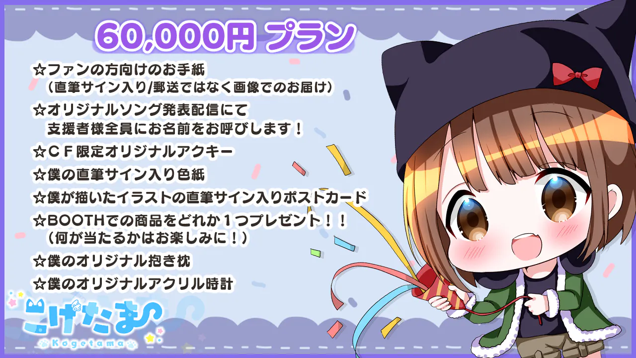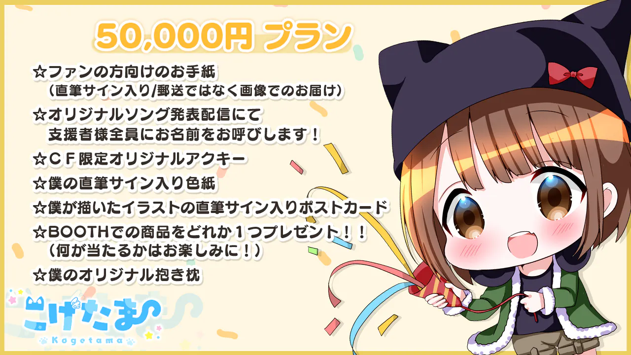 2022/04/17 11:15リターングッズの紹介!3000円プランをしていただいた方にはもれなくアクキーがついていきます!こちらはいつもお世話になっているショコラさんが描いたイラストになります!50000円プラン支援した方には抱き枕カバーをリターンで返します!!こちらもショコラさんがお描きしたものになり、両面印刷でめちゃくちゃ可愛いのでお手に取って頂けると嬉しいです!最後にですが、オリソン公開後は新衣装の発表やJOYSOUNDさんの配信、iTunesさんに配信も検討しているのでリリースされ次第、Twitterにて告知したいと思います!!お楽しみに!! もっと見るオリジナルソングのリターングッズについて