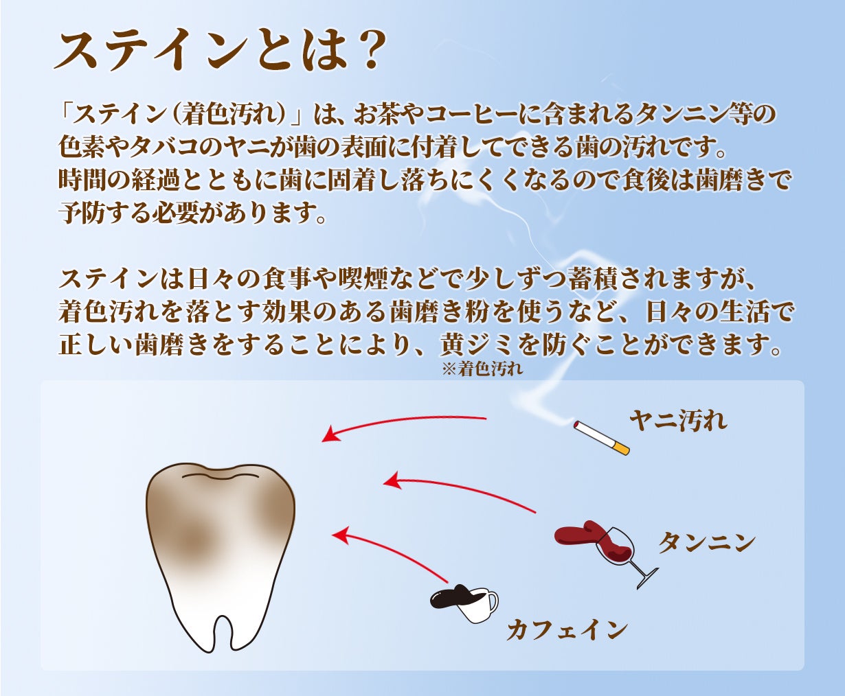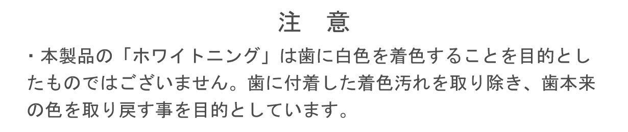成分 :基剤:重質炭酸カルシウム/清掃剤:ヒドロキシアパタイト、無水ケイ酸/香味剤:ハッカ油/薬用成分:グリチルリチン酸ジカリウム/甘味剤:キシリット、ステビアエキス/発泡剤:N-ラウロイル-L-グルタミン酸ナトリウム/清掃助剤:クエン酸ナトリウム、ポリリン酸ナトリウム/着色剤:酸化チタン/湿潤剤:スイカズラエキス/着香剤:香料/溶剤:無水エタノール、精製水