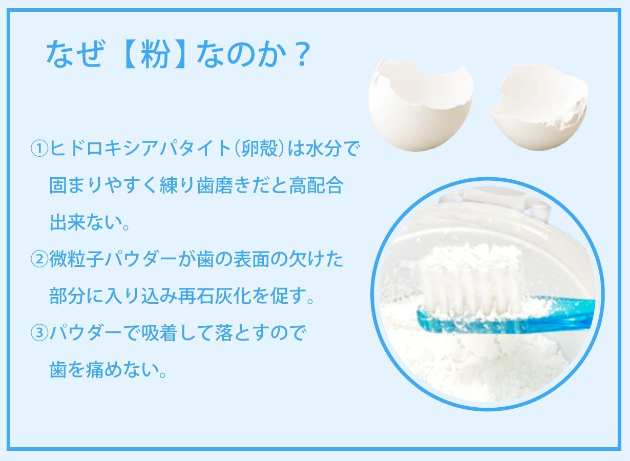 アパタイトはリン酸カルシウムの一種で,歯や骨の主成分として知られるアパタイトを「ヒドロキシアパタイト」(Hydroxyapatite,HAp)と言います。ヒトの歯のエナメル質の97%はこの「ヒドロキシアパタイト」で出来ています。ttt(スリーティー)は卵殻由来のヒドロキシアパタイトを使用しておりますので地球にも優しくエコな素材です。