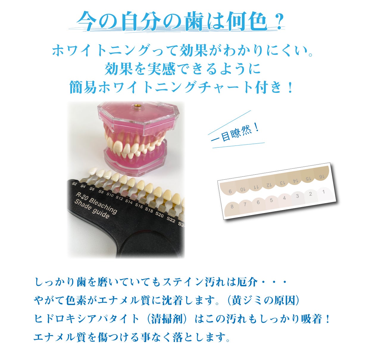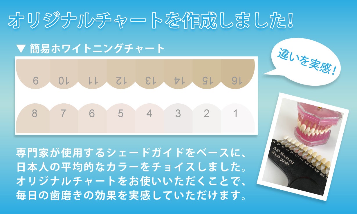 オリジナルのホワイトニングチャートも苦労しました。ランクや記号が国や会社で様々であり統一されていませんでした。歯科医用に販売されているシェードガイドを購入し、どの色がベストかを追求し日本人に合った色のガイドをオリジナルで作製しました。