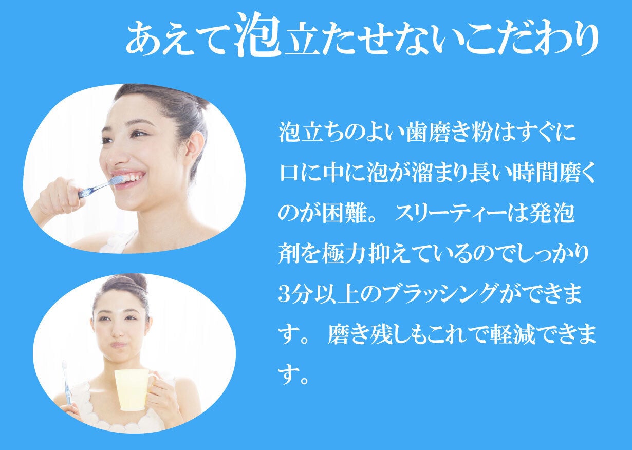 しっかり磨きたいから、あえて発泡剤は必要最小限に抑えております。泡で口の中がいっぱいにならないからすみずみまでしっかり磨く事ができます。