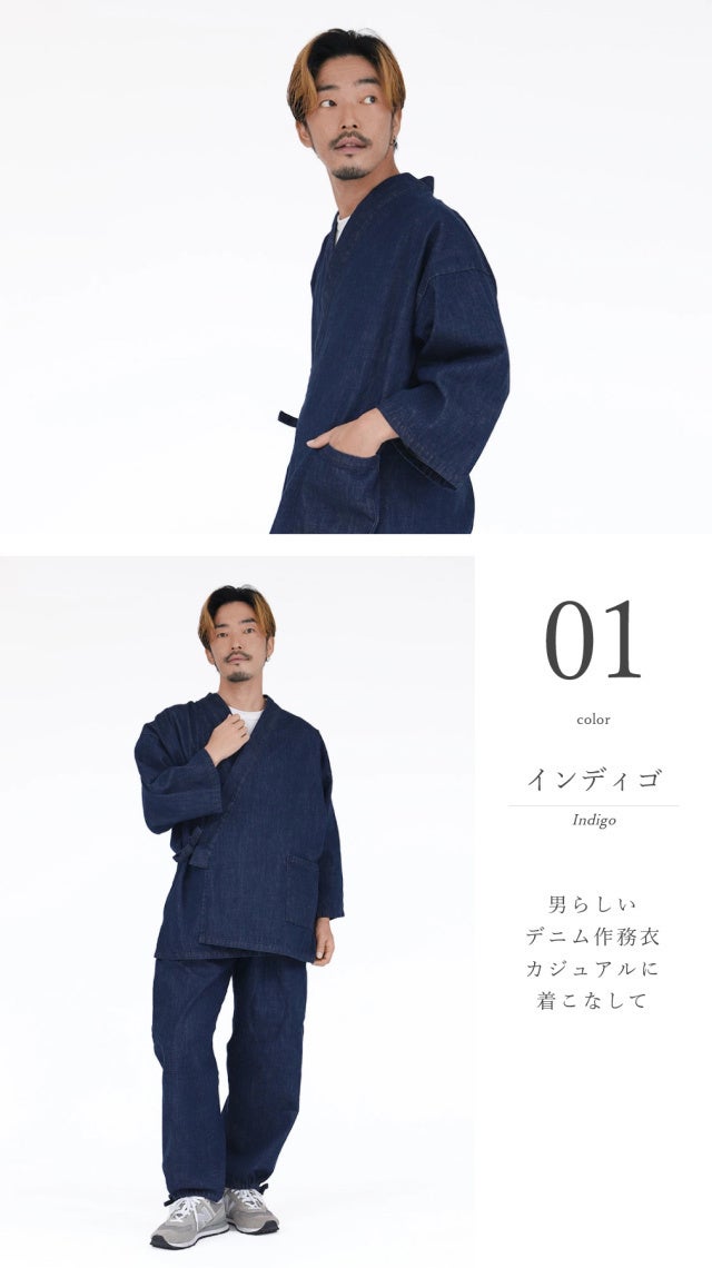 世界的に有名なデニム生地メーカークロキのオリジナルブランド「和魂藍」を使い、デニムの街児島で制作した作務衣。