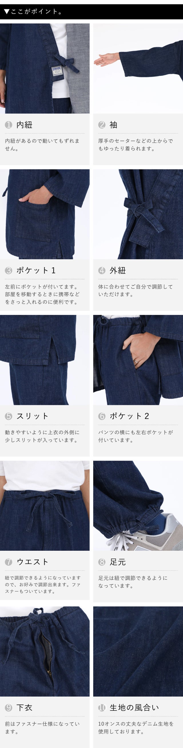 国産デニムの中心地、岡山県にて生地製織から縫製まで行った、ひとつ上のデニム作務衣を、たゆたふならではのクオリティ&プライスで!