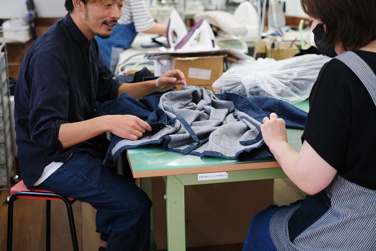 今回のプロジェクトでも、「産地に根付いた商品をお届けしたい」との思いから、生地選びから縫製仕様まで、デニムのプロ 児島ジーンズ様と打ち合わせを繰り返し「本藍デニム作務衣」を制作しました。
