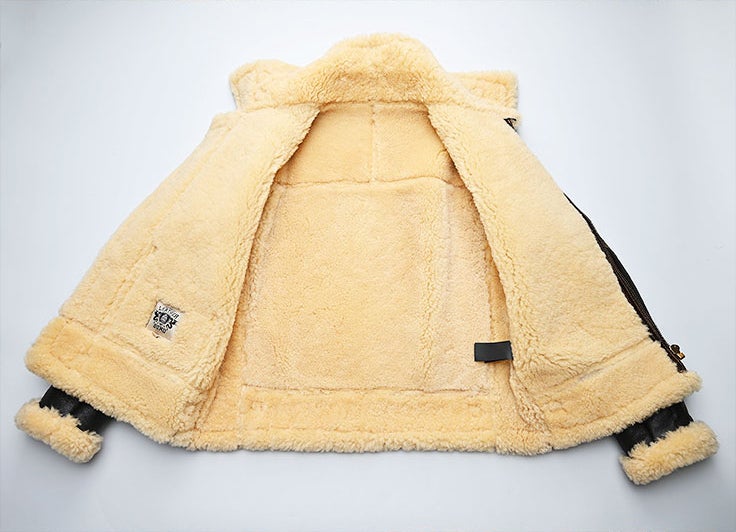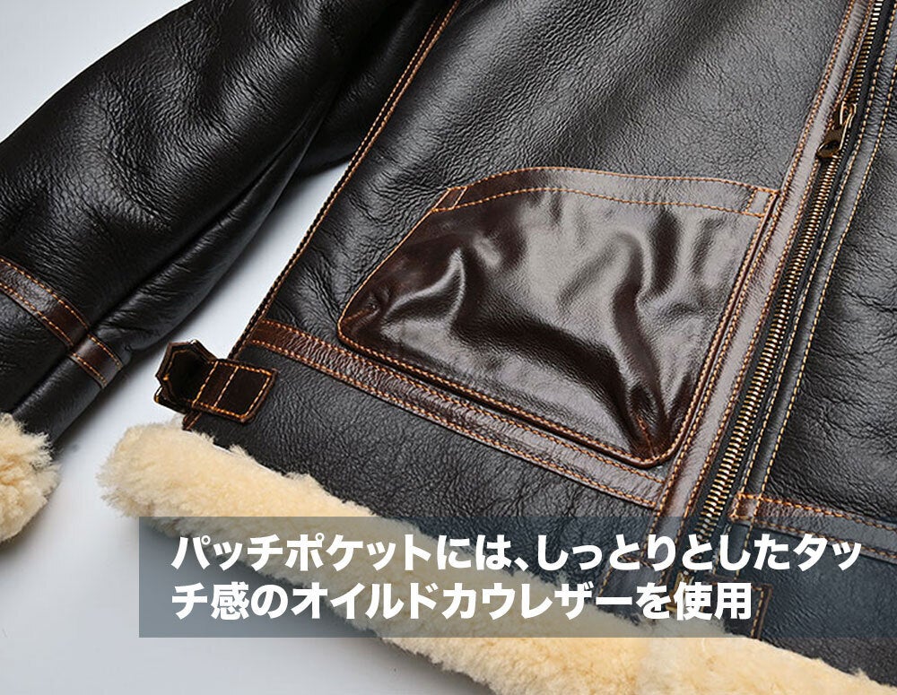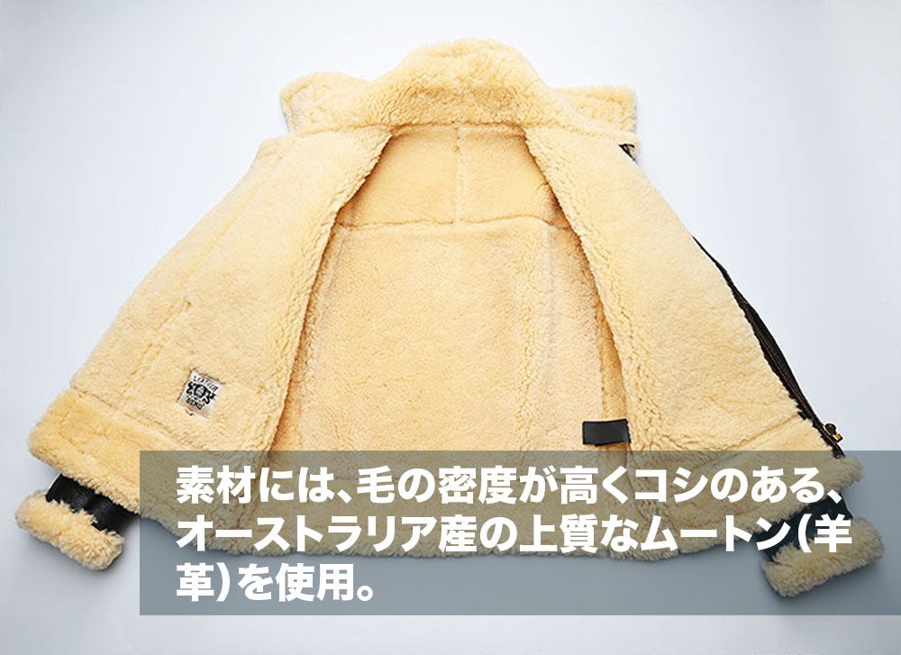 ボマージャケットの代表格としても知られる、フライトジャケット「B-3」をモチーフにしたムートンジャケットです。 素材には、毛の密度が高くコシのある、オーストラリア産の上質なムートン(羊革)を使用。 毛足が長く、非常に保温性に優れた一着となっています。