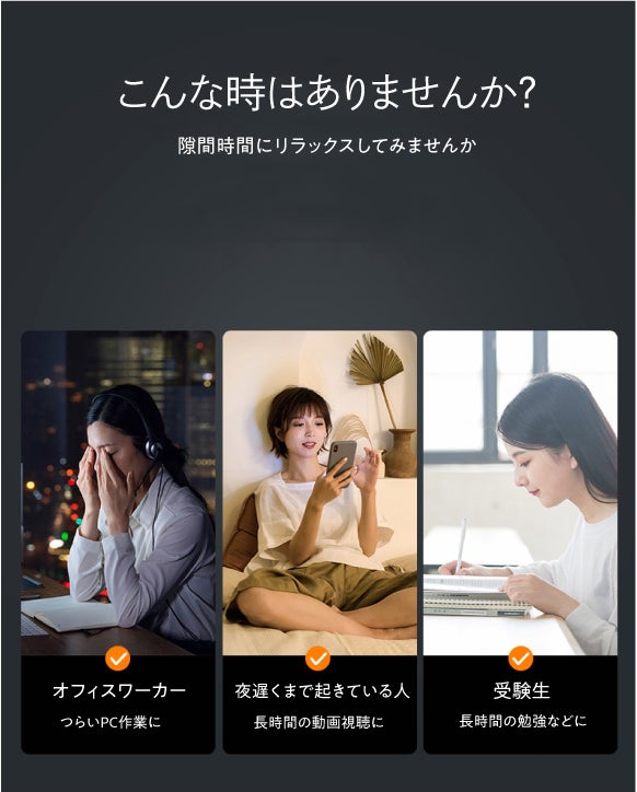 眼精疲労や頭痛などを解消したい方。安らぎの音楽とともにリラックスしたい方。手軽に目の疲労をとりたい方。ぜひこのアイマッサッジャーをお使いください。皆さんの疲労を解消し、快適な生活をお約束します。ただし、使い過ぎや使用中に違和感を感じた場合には、取扱いを中止してください。