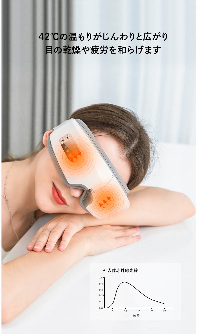 この商品は42度の一定の温度を保ちつつ細かく振動することによって目の疲労感を和らげると購入されたお客様からの評判です。