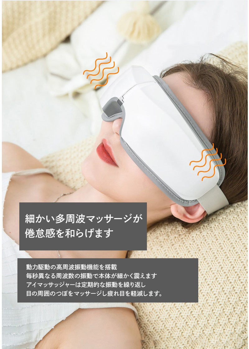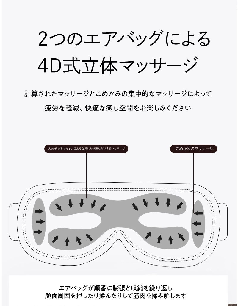 アイマッサージャーのエアバッグが疲れた目を優しく包み込み、目の周囲の筋肉を押したり、揉んだり、人工的に設計された動きであなたの筋肉を揉み解します。