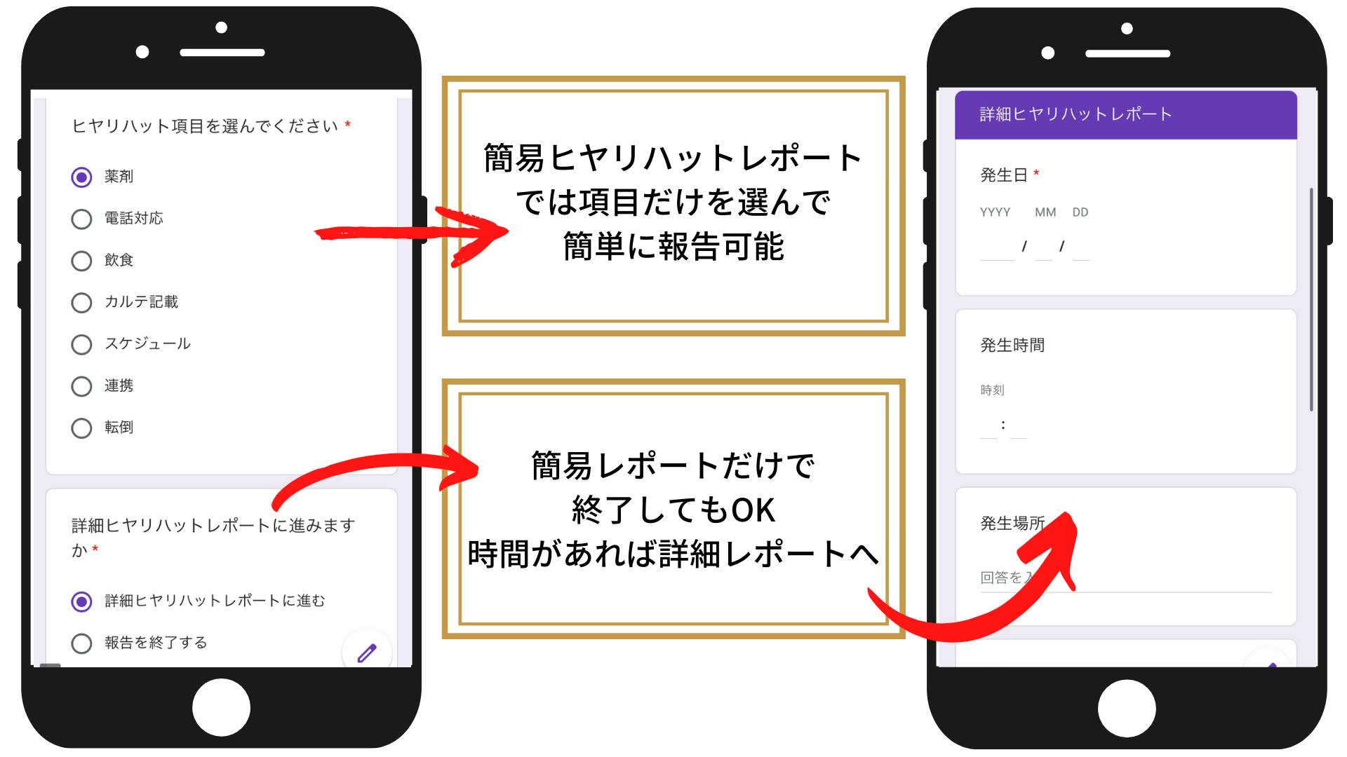 時間に余裕があればそのまま詳細レポートにうつり詳しいヒヤリハットレポートの内容を入力できますし、時間がない場合は簡易レポートのみで終了することもできます。