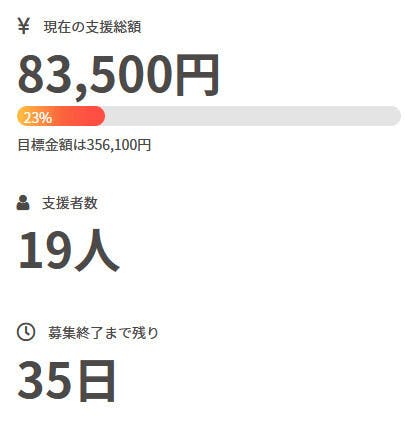 現在の調達率は23%、パトロン様は19名となっております。