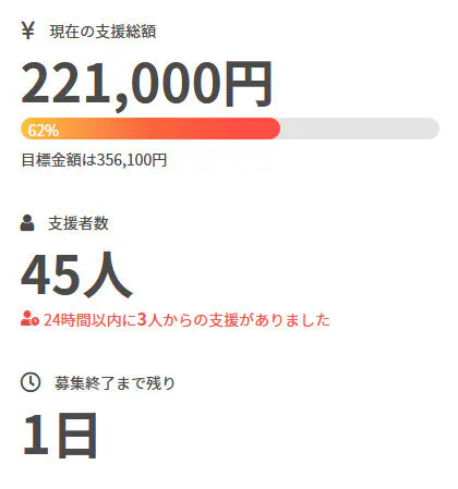現在の調達率は62%、パトロン様は45名となっております。