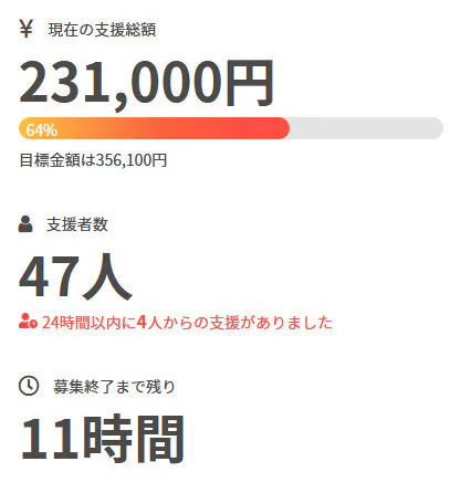 現在の調達率は64%、パトロン様は47名となっております。