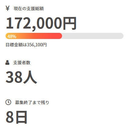 お世話になっております。 名無しの東北県人です。 前回の活動報告から現在までの間に、 新たに1名の方がご支援を行って下さいました。 現在の調達率は48%、パトロン様は38名となっております。 本当にありがとうございます。 引き続き、何卒宜しくお願い致します。 名無しの東北県人