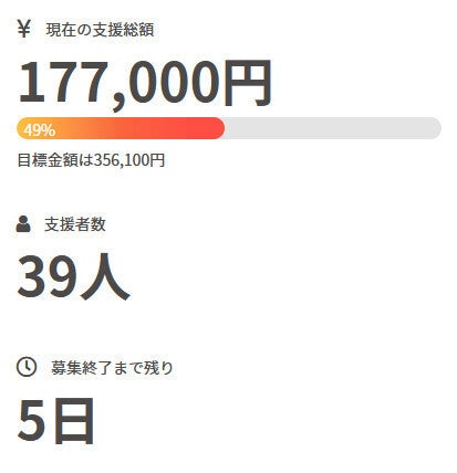 お世話になっております。 名無しの東北県人です。 前回の活動報告から現在までの間に、 新たに1名の方がご支援を行って下さいました。 現在の調達率は49%、パトロン様は39名となっております。 本当にありがとうございます。 引き続き、何卒宜しくお願い致します。 名無しの東北県人