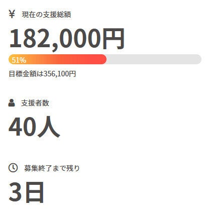 お世話になっております。 名無しの東北県人です。 前回の活動報告から現在までの間に、 新たに1名の方がご支援を行って下さいました。 現在の調達率は51%、パトロン様は40名となっております。 本当にありがとうございます。 引き続き、何卒宜しくお願い致します。 名無しの東北県人