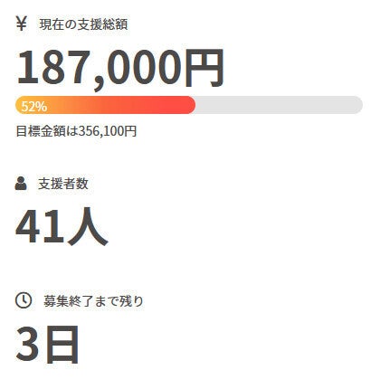 お世話になっております。 名無しの東北県人です。 前回の活動報告から現在までの間に、 新たに1名の方がご支援を行って下さいました。 現在の調達率は52%、パトロン様は41名となっております。 本当にありがとうございます。 引き続き、何卒宜しくお願い致します。 名無しの東北県人