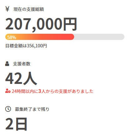 お世話になっております。 名無しの東北県人です。 前回の活動報告から現在までの間に、 新たに1名の方がご支援を行って下さいました。 現在の調達率は58%、パトロン様は42名となっております。 本当にありがとうございます。 引き続き、何卒宜しくお願い致します。 名無しの東北県人
