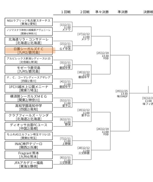 いよいよU-15女子サッカーの全国大会まで残り5日となりました。12/11(土)の初戦は北海道1位通過の「北海道リラ・コンサドーレ」さん、北と南の対戦です!貴重な体験から多くのことを学びに行ってきます!引き続きご支援のほど、何卒よろしくお願いいたします。↑文字をクリックしたらトーナメント表の全体が見れます。
