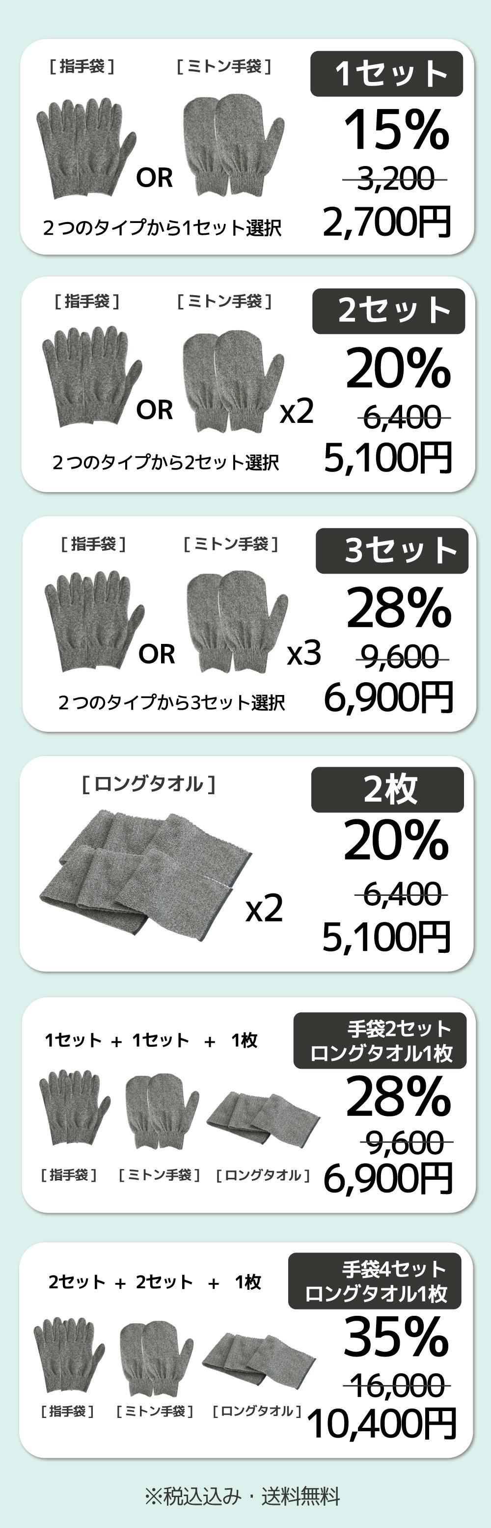 手袋は2枚入り1セット、ロングタオルは1枚入りとなります。