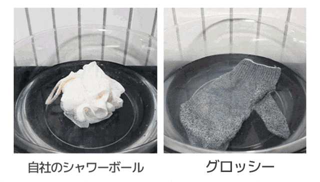 お肌の弱い方や優しく使っても刺激を強く感じる方はグロッシータオルに直接石鹸やボディソープをつけて泡立てカラダを洗ってください。