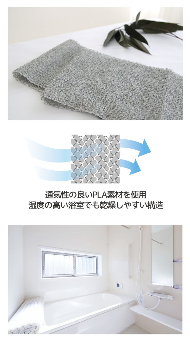 また通気性抜群のPLA素材を使用して素早く乾燥し、湿度の高い浴室でも快適に使用できます。