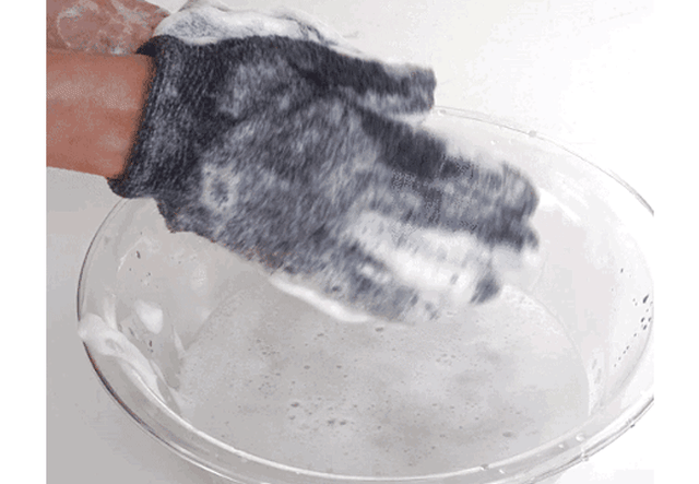 グロッシータオルを水につけて泡立てた石鹸やボディソープをこすって泡を立てます。この時にお湯をつけるとより柔らかい泡ができます。