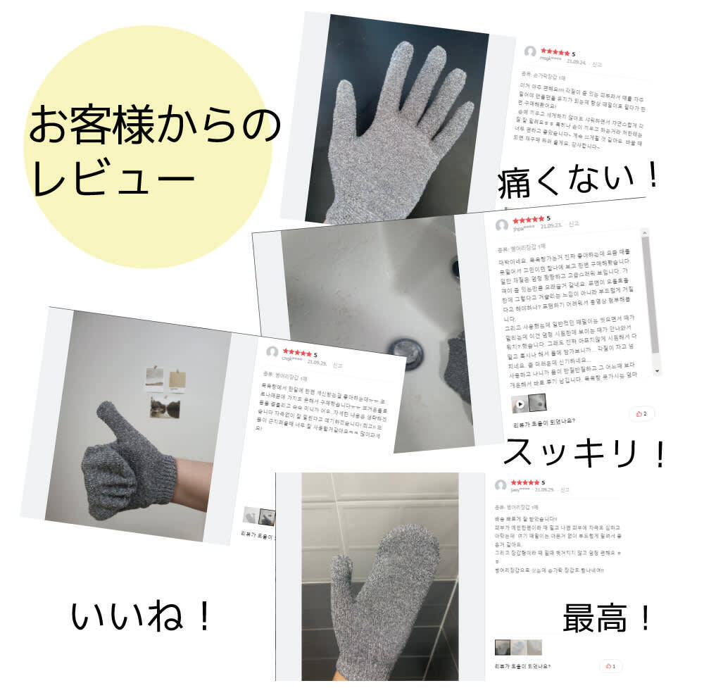 お客様が使用後のレビューの中で一番多かったご意見は痛くありません!"お家で簡単に垢すりができる""使いやすい"角質が簡単に取れる!初めて感じるスッキリさ!などのご意見がありました。グロッシータオルは満足度も高く お客様からのリピートも多い商品です。この機会にいかがでしょうか?