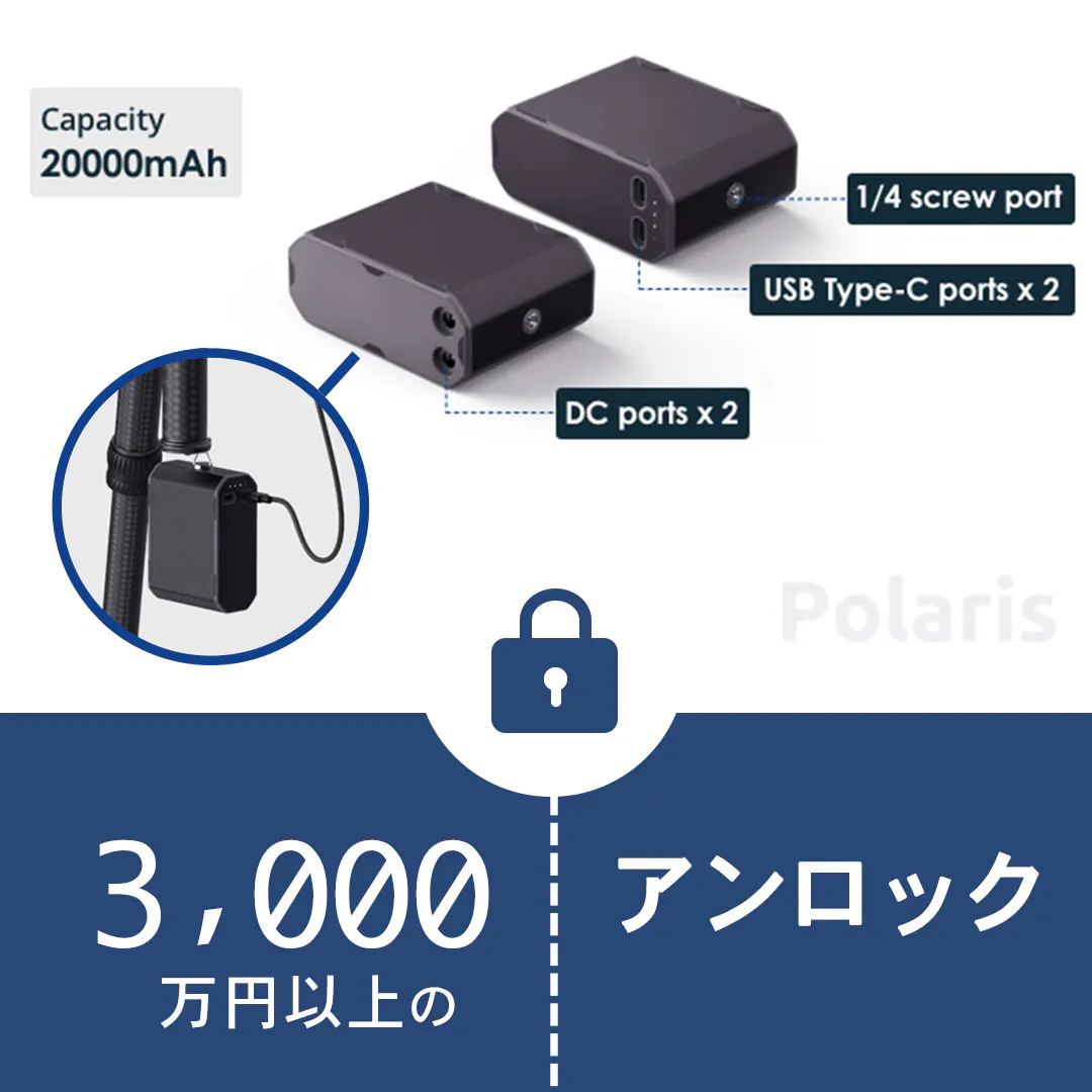 ポラリスは、好評をいただき約1週間で2,000万円を超えるご支援をいただきました。このタイミングで、皆さまに恩返しの意味を込めて、3,000万円以上の資金が集まった際には、リターンに加えて予備のバッテリーをプレゼントさせていただくことを決定いたしました!