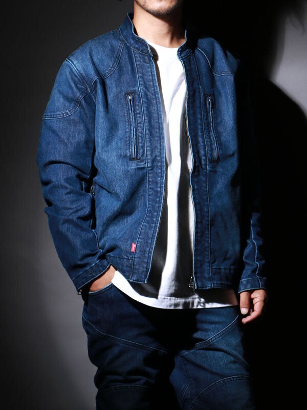 こちらもパンツ同様、レースで使用されるレザースーツのデザインを採用したデニム素材のライダースジャケット。
