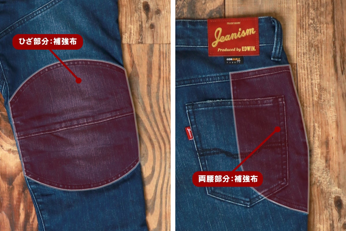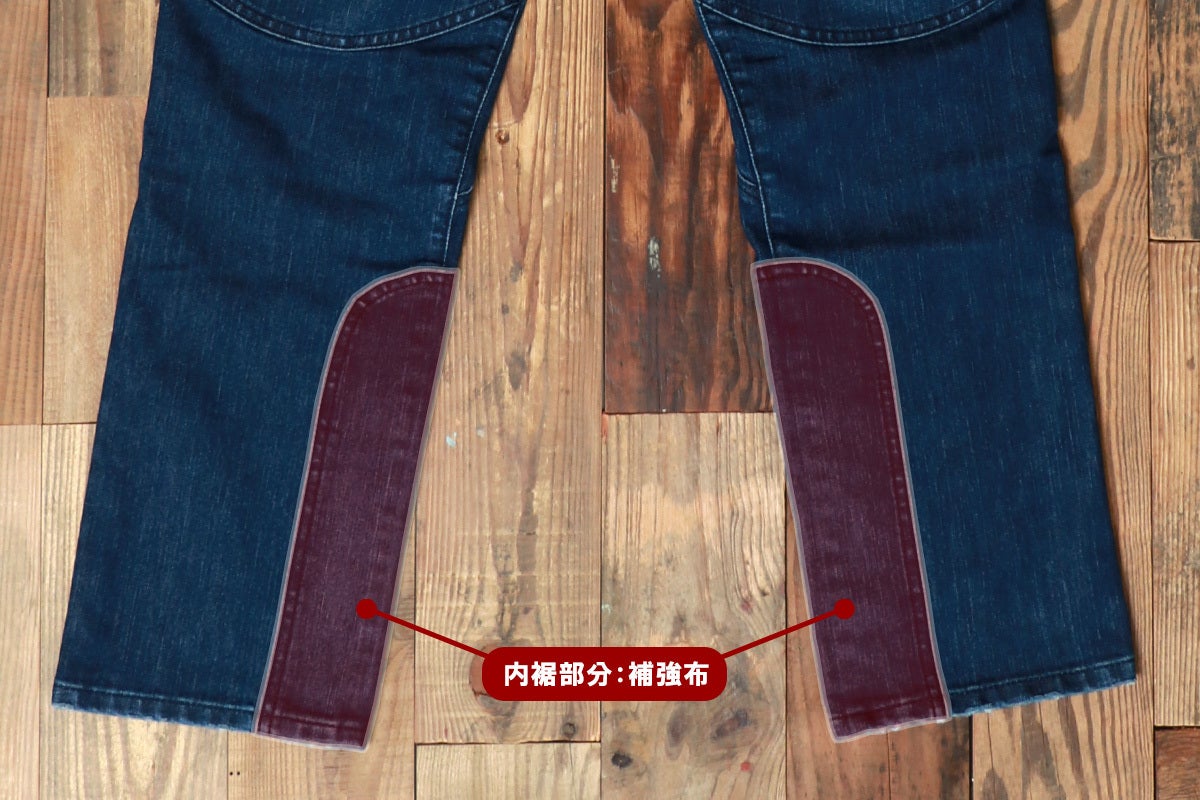 バイクに跨った時のシルエットを考慮し、EDWIN社独自の縫製技術で組み立てられています。