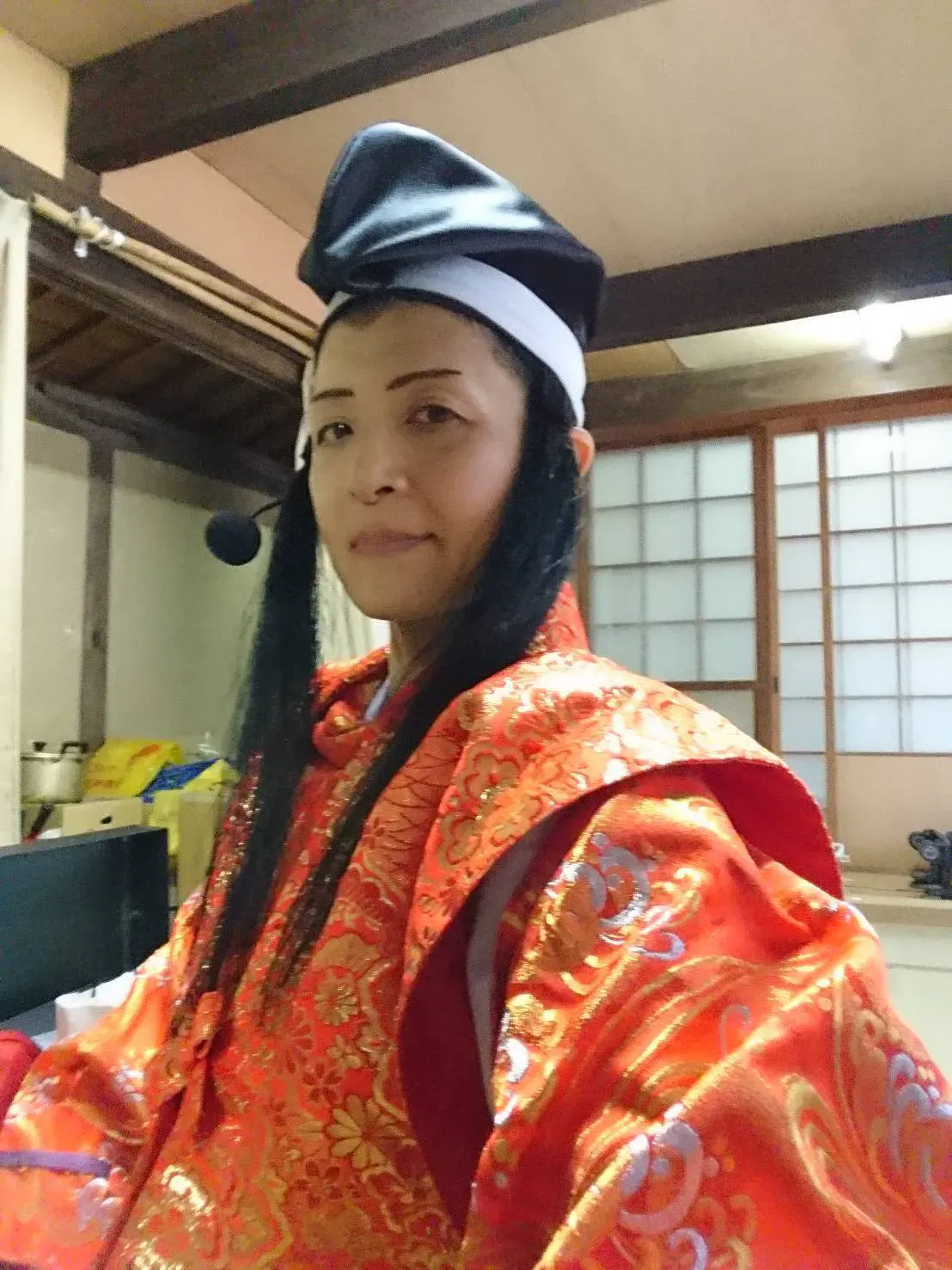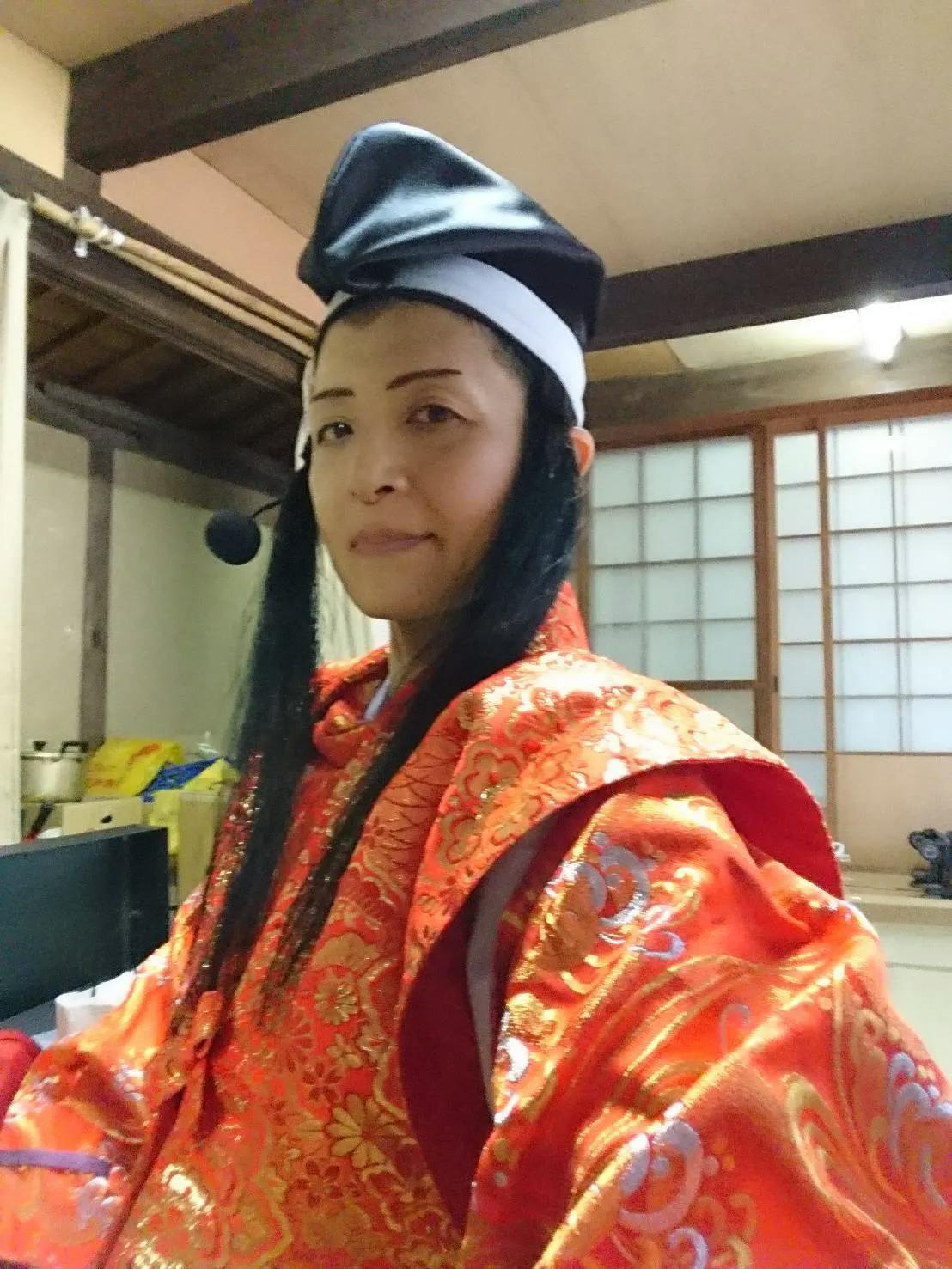 この度は、脚本演出させて頂きました。自分で書いてながら、そんなのあり?ツッコミ連発の展開。フィナーレまで、皆んなついて来てくれるかな〜?役は、天守閣に千年昔から住むという巫女で、かぐや姫と従兄弟同士という『初音(はつね)』です。