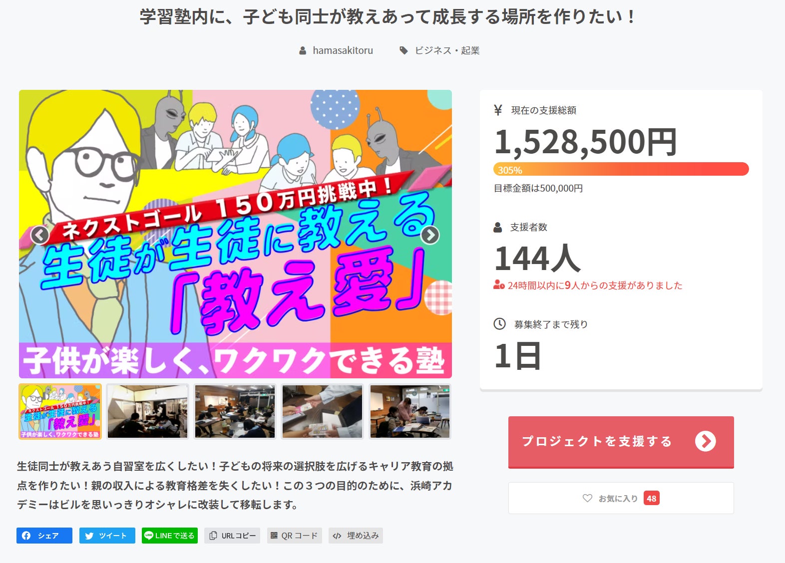 2022/01/18 23:5912月23日に始めた、僕のクラウドファンディング「学習塾内に、子ども同士が教えあって成長する場所を作りたい!」は121人の方に1346000円も支援して頂いております。皆さん、本当にありがとうございます。残り11日となってきました。何とかラストスパートでネクストゴールの150万円を達成してオリジナル壁紙(フライングで発注済)を貼りたいと思います。と言うことで、新規のリターンを追加しました!【スリッパスポンサー第2期】第1期がすぐにSOLD OUTのご好評につき追加しました。塾の店舗で生徒が履くスリッパに好きな名前を入れる権利です。※第1期のスリッパが摩耗して交換する時期に実行します。2022年の夏ごろと思っていてください。どんな名前が入るか今から楽しみです!【サトちゃん&岩ちゃん あなたの悩みを全力で解決!】またまた友人が僕のために友情リターンを出してくれました。敏腕コンサルタントと凄腕営業マンの二人が、相談されたお悩みを知恵を振り絞って全力で解決してくれます!【なるちゃんとサシ飲み】需要があるか分かりませんが、アホほど酒を飲む #完成されたアル中 の僕とサシでお酒を飲みませんか?※酒癖は悪くはありません。だいたいは楽しく飲む人です。※ただし、普段から尖ってる性格が酔うともっと尖って来て社会や大人に毒を吐くことが多くなります。※料理はそんなにたくさんは食べませんが、ハイボールをアホほど飲みます【浜崎アカデミーの教室を貸し切り利用権】横川駅南口すぐの横川本通り商店街ど真ん中の、浜崎アカデミー教室を貸し切り利用できます。オシャレな内装&照明新設の換気設備×2&53㎡の広い空間で、コロナ対策もバッチリ!大型プロジェクターや照明&高音質のマイクなどの、配信設備もレンタルできます。学習塾は平日夕方からしか稼働しません。この空間を割安でレンタルできます。レンタルして、お茶会やワークショップ、講演会、動画撮影等様々な用途にお使い頂けます。ワクワクするような新店舗の空間で、誰がどんな面白い使い方をしてくれるか?今からワクワクしてます! もっと見る