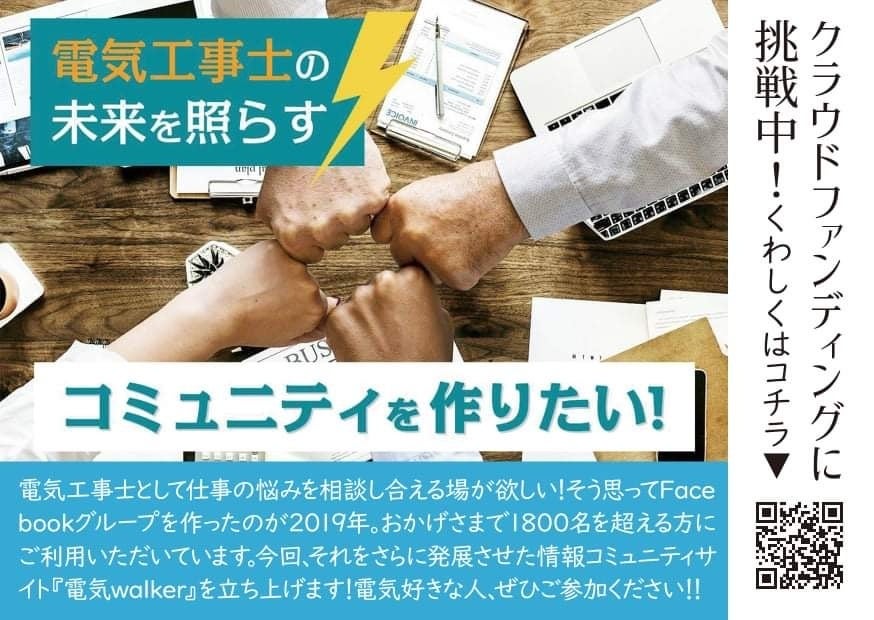 後残り3日となりました。自分と同じように悩んでいる方のお役に立ちたいとFBグループ電気工事士さん情報共有しませんかを立ち上げて四年経ちました。2425名が登録していただき、現在相談できる場として賑わっております。そんな相談できる場所がもっと便利な場所になったらと思い作り上げるのが今回の生涯学習情報コミュニティサイト電気walkerです。スポンサーになっていただける方募集しております。バナースポンサー様。リンクスポンサー様 スペシャルバナースポンサー様まだまだ募集しております。よろしくお願い致します。