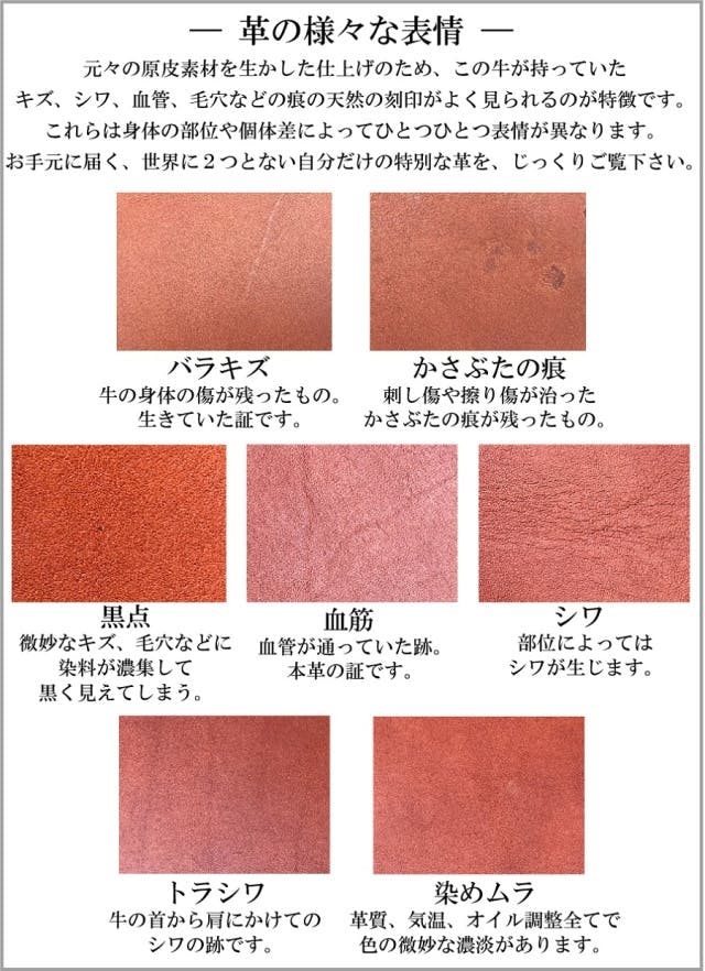 ※本製品は天然皮革素材を使用しています。革本来が持つ色ムラ、キズ、シワ、血筋等が見られます。天然皮革素材ならではの個性としてご理解ください。