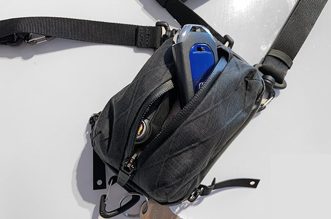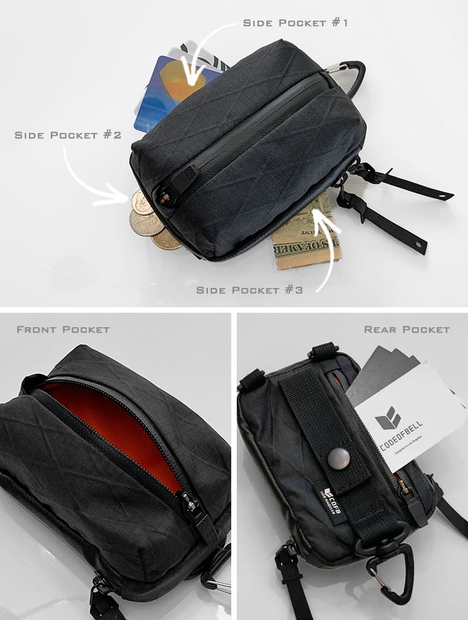 フロントポケットはドーム型になっており、毎日持ち歩くさまざまな必需品を収めることができる十分なスペースを作り出しています。車のカギから、ポータブルEDCツール、ワイヤレスイヤホン、スペアマスクなどが入ります。