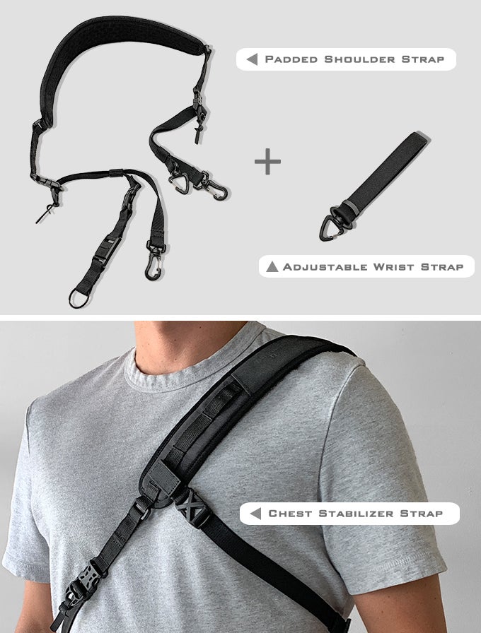 ANNEX 360の快適性、外観、操作性をさらに向上させるために、標準のショルダーストラップに替えて、パッド付きショルダーストラップ+リストストラップ+チェストスタビライザーストラップをセットにしたANNEX STRAP KIT(アネックスストラップキット)を用意しました。
