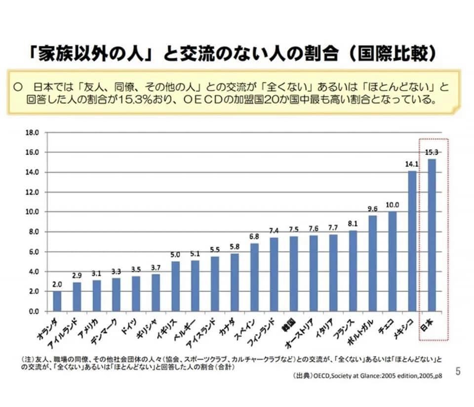 家族以外との交流がない社会的孤立人口の割合が国際比率でみると