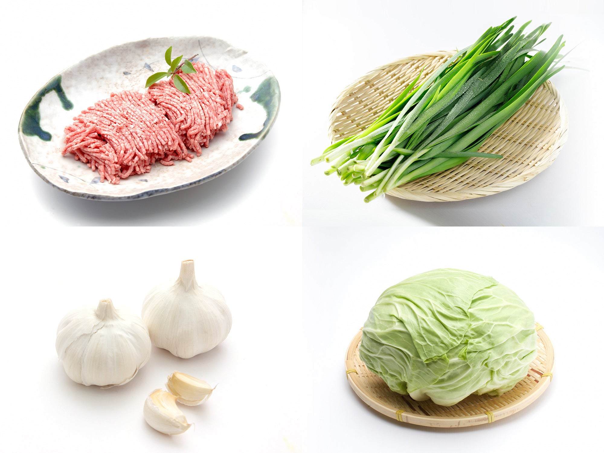 【餃子】キャベツ(宮崎県産)、豚肉(宮崎県産)、小麦粉、ニラ(宮崎県産)、にんにく(宮崎県産)、澱粉、砂糖、塩、コショウ、ごま油、調味料(アミノ酸等)、酒精、発酵乳酸ナトリウム(原材料の一部に小麦を含む)※辛餃子のみ唐辛子を含む
