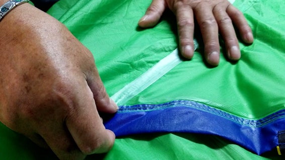 こんな感じの物です(透明なテープだったり、裏地に合わせた色のテープだったりします)。雨でも中が濡れないようにというアウトドアウェアやテント特有の処理でもあります。