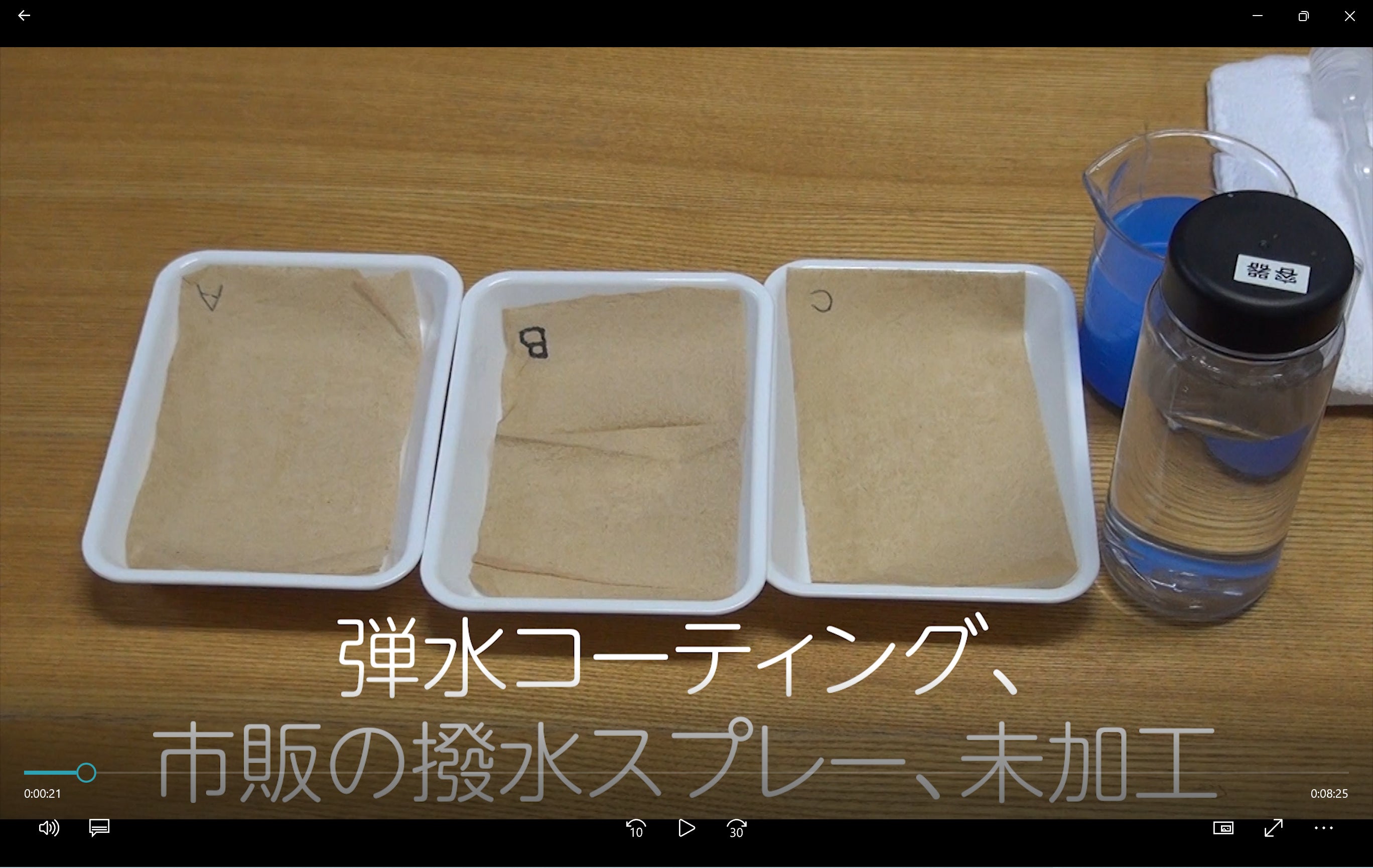 今回は3枚の紙を用意して、それぞれの紙に弾水コーティング、市販の撥水スプレー、未加工の3条件を施しています。