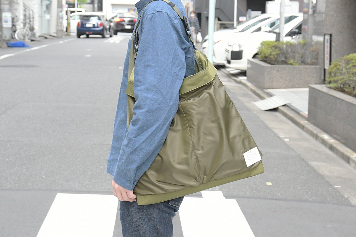 ショルダーベルトの形状を工夫し、最短↔最長の調整幅を自社他商品のショルダーベルトより大きくしナナメ掛け、肩掛けに対応出来る仕様にしました。