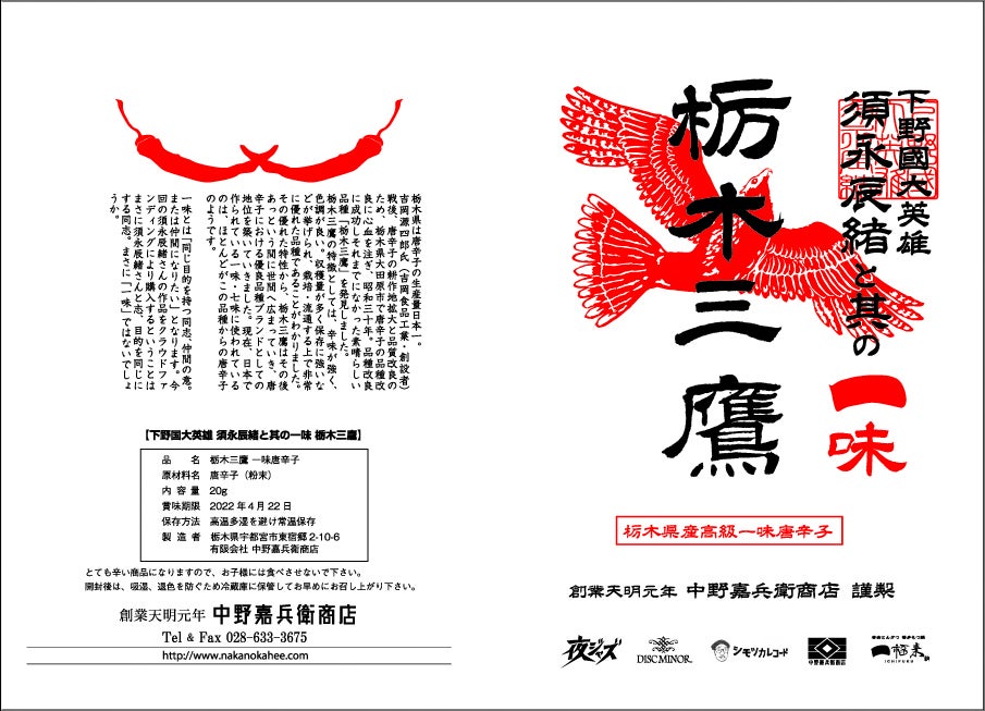 昭和30年に発見された唐辛子の品種「栃木三鷹(とちぎさんたか)」は、辛みが強く、色調が良く、収穫量も多く、栽培・流通の面からも優れ、あっという間に世間に広がっていきました。現在、日本で作られる一味・七味に使われているもののほとんどが「栃木三鷹」をルーツにもちます。栃木県大田原市は唐辛子の生産量日本一で、市内には「栃木三鷹」を使用した料理や商品を多数販売しております。「下野國大英雄 須永辰緒と其の一味 栃木三鷹」も厳選した栃木県産唐辛子「栃木三鷹」を使用した一味唐辛子です。一味とは「同じ目的を持った同志、仲間。またそのような仲間に加わることの意」でもあります。「下野國大英雄 須永辰緒と其の一味 栃木三鷹」は、今回のクラウドファンディングのためのみに製造された意味のある限定品になります。