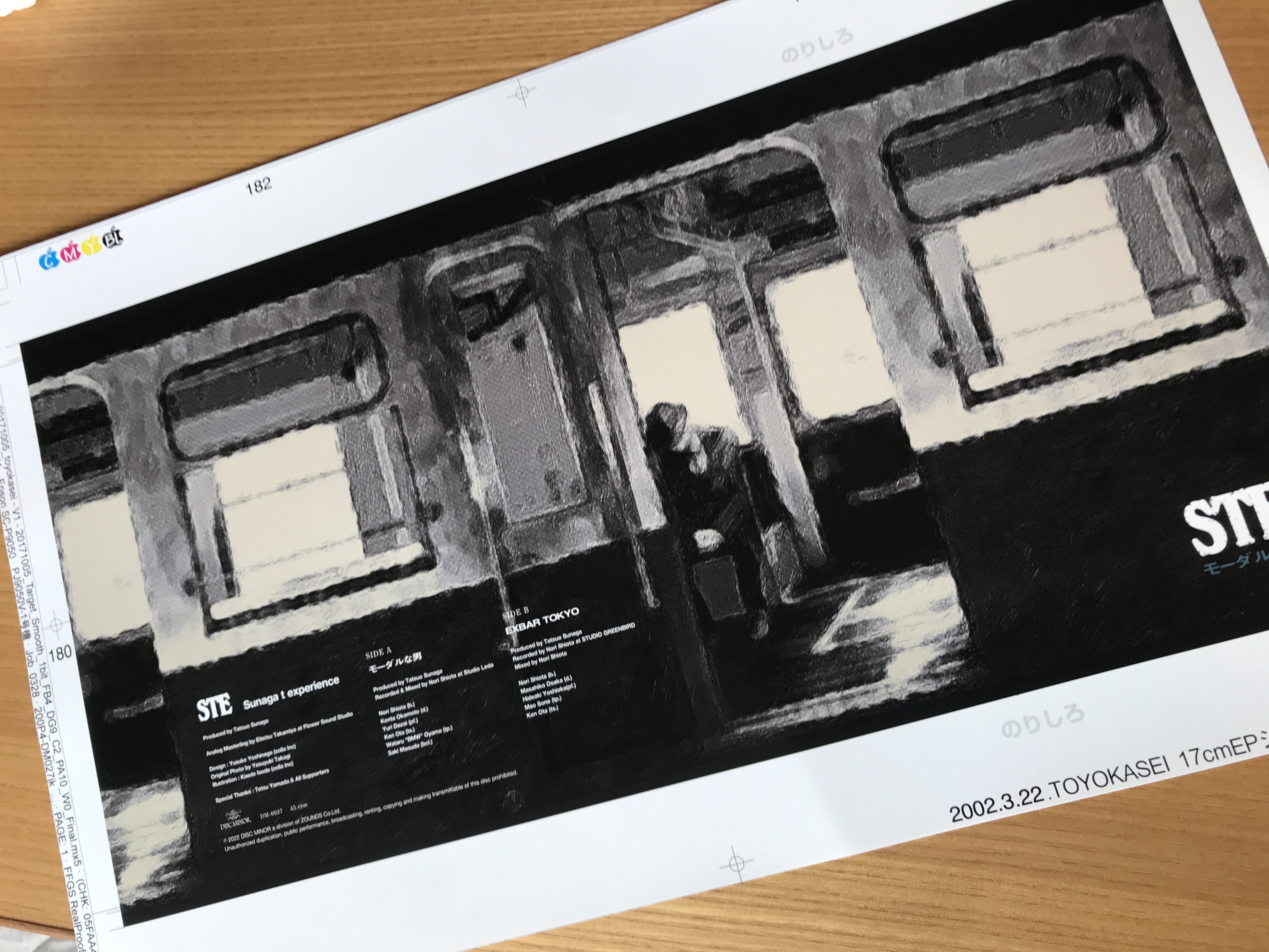 『モーダルな男/EXBAR TOKYO』こちらは校正確認用のジャケット台紙です。これを艶出し加工して厚みを出したものを貼り合わせて筒型にしてジャケットとなります。今回デザインしてくれたのは(というか僕の作品はほぼですが)いつの間にか音楽業界では一番忙しくなってしまったデザイナーの吉永祐介です。先日のThe ROOM COFFEE&BARでの展示会も記憶に新しいですが、彼はそもそもレディメイドで小西康陽さんのデザインにおける思想の薫陶を受け、DJとしては僕のプレイに学び、とまあまあ長い付き合いになります。そしてこの元となる写真を提供してくれたのは写真家の高木康行氏。彼もまたDJだったりスタイリストを経てフォトグラファーに転身してからの活躍は素晴らしいもの、付き合いも30年はとっくに超えているかと思います。そんな古い仲間達の協力で作った快心のパッケージのストーリーも込みでいつまでも大切にして頂けると幸甚です。
