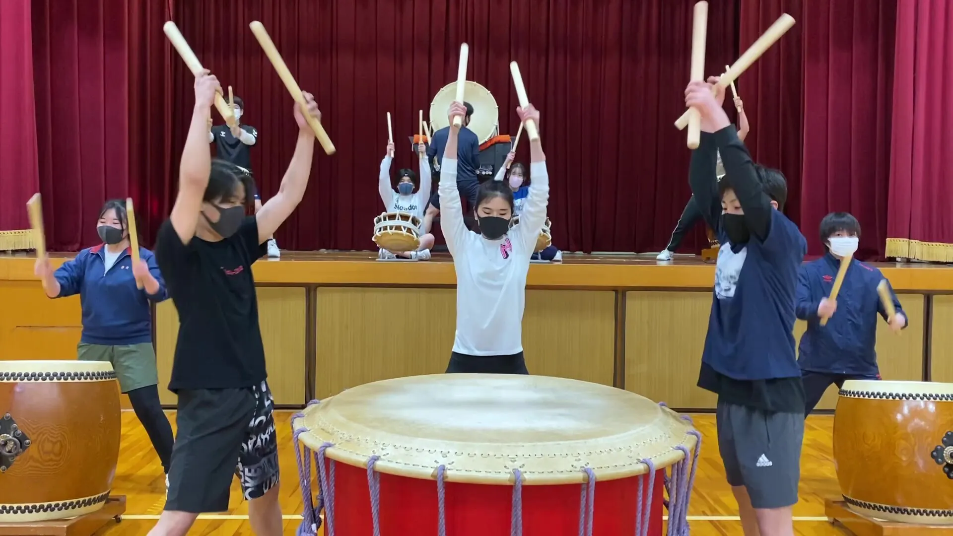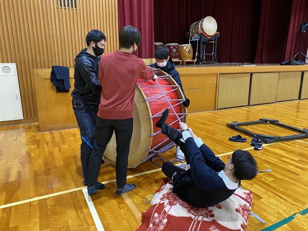 2022年の初日は桶胴太鼓の紐を締めて、部員一同、気持ちを新たにスタートしました。